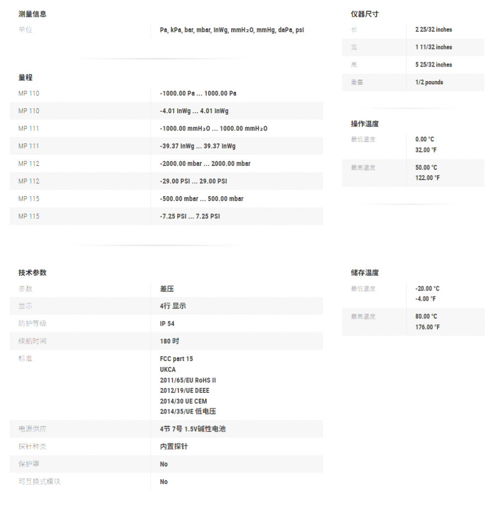 详细信息IP属地 广东 产品信息: 测量空气差压 显示最小值和最大值 选择测量单位 设置自动关机 测量值定格 显示屏背光 随货提供: 1 法国工厂校准报告 1 便携包 2 1 米长硅胶管,直径 Ø4 x 7 mm (MP 110 和 MP 111) 1 直径 Ø6 x 100 mm 不锈钢管 (MP 110 和 MP 111) 2 1米长塑料软管,直径 Ø4 x 6 mm (MP 112 和 MP115) 1 使用说明书 |