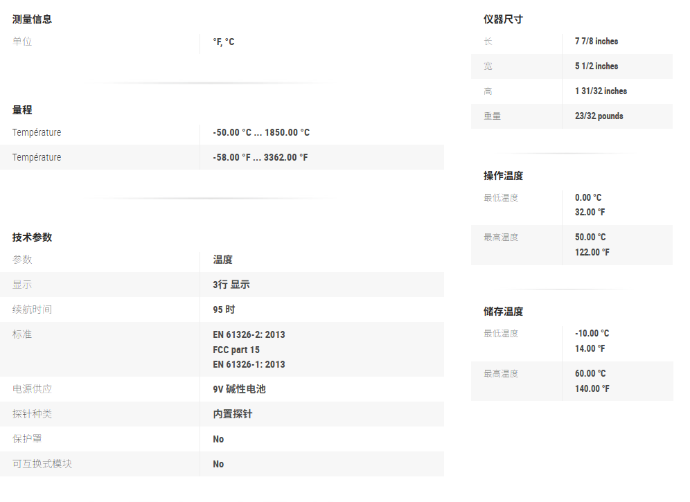量程: -50°C ~ +1,850°C