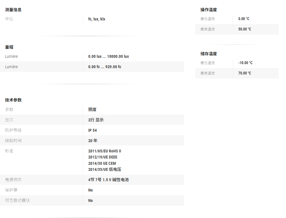 量程:0 ~ 10,000 lux 或 0 ~ 929 fc