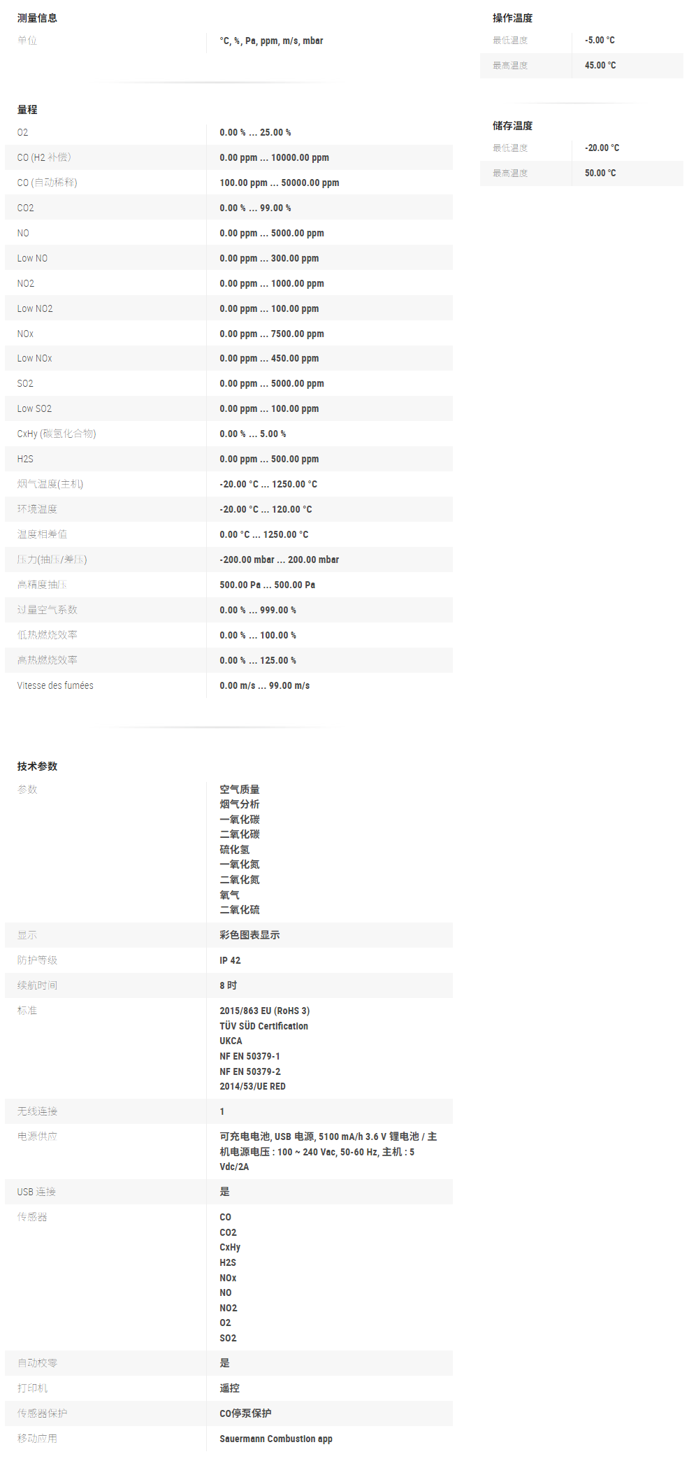 最多可安装6种气体传感器:O2, CO-H2, NO, Low NO, NO2, Low NO2, SO2, Low SO2, H2S 和 CxHy