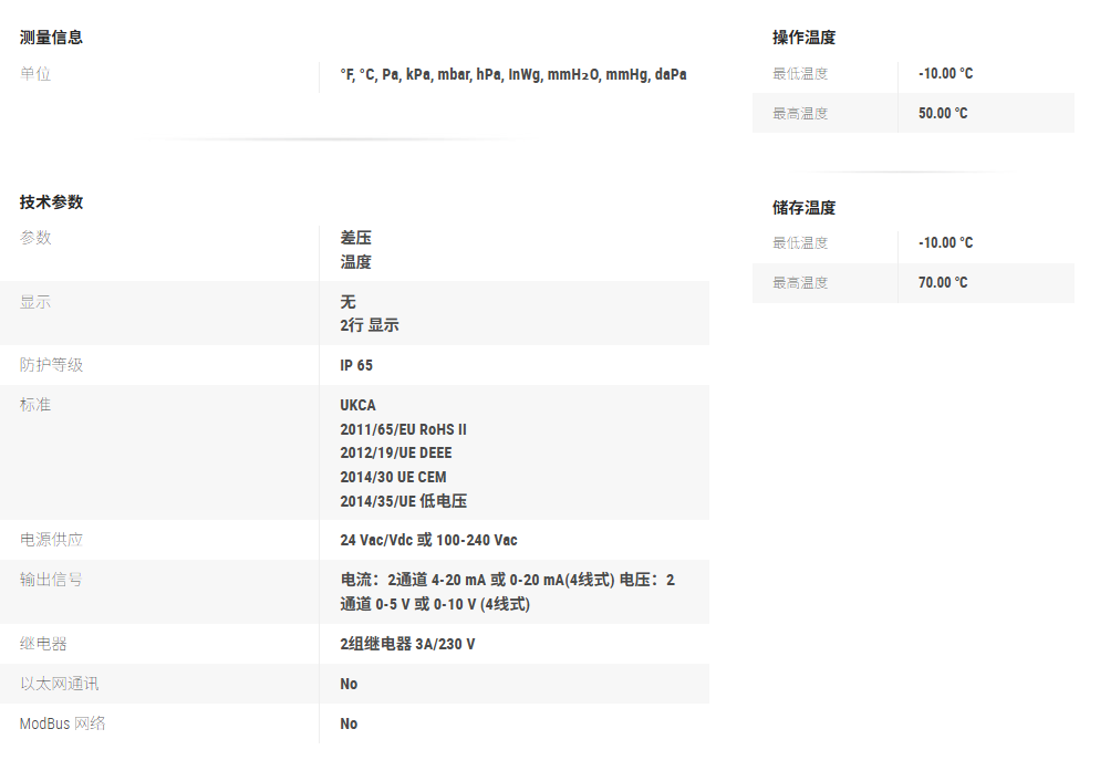 详细信息IP属地 广东 产品信息: 差压:-100~+100Pa 可外接一组分体式铂电阻PT100温度探头 温度量程 : -100 ~ +400 °C 在线自动校准 两组继电器输出 输出信号:两通道4线式0~5/10V,0/4~20mA(择其一) 电源24 Vac/Vdc 或 240 Vac 显示测量趋势箭头指标 工业塑料外壳,IP65 防护等级 可选择有或无数字显示屏 随货提供固定背板